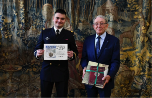 Ainsi, René Darracq (Bx 60), Pharmacien général inspecteur (2S) et administrateur et membre du bureau de l’ASNOM, a remis ce prix au major de cette promotion, le Pharmacien des armées Matthias Brione. Ce prix consiste en un bon d’achat pour ouvrages scientifiques et la remise de deux livres « Une École centenaire » et « Itinéraires » qui illustrent la mémoire de l’Ecole Santé Navale et celle de nos Anciens qui l’accompagneront lors de sa première affectation à la Direction Interarmées du SSA en Polynésie Française.