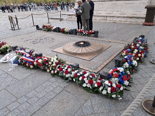 En ce jour du 15 octobre 2025, le ravivage de la flamme était confié au Service de santé des armées (SSA) et particulièrement aux élèves et anciens élèves des écoles du SSA et du Val-de-Grâce. Cette cérémonie était placée sous la présidence du MGA Jacques Margery, Directeur central du SSA, accompagné du MGA Sylvie Pérez (Bx 83), Inspectrice générale du SSA. La musique de la gendarmerie mobile était présente pour l’occasion et a animé cette manifestation qui a donné lieu à un dépôt de gerbe sur la « dalle de granite » réalisé conjointement par l’ASNOM et la SEVG (Société Amicale des élèves et anciens élèves des écoles du SSA et de l’école du Val de Grâce).